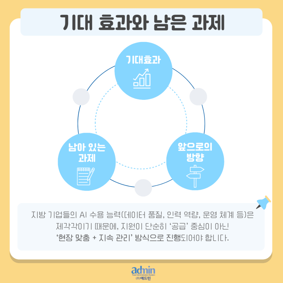 하지만 과제도 남아 있습니다. 지방 기업들의 AI 수용 능력(데이터 품질, 인력 역량, 운영 체계 등)은 제각각이기 때문에, 지원이 단순히 ‘공급’ 중심이 아닌 ‘현장 맞춤 + 지속 관리’ 방식으로 진행되어야 합니다. 또한 정부와 지자체, 민간 기업 간 협력 구조가 얼마나 잘 작동하느냐가 정책의 성패를 좌우할 것입니다.