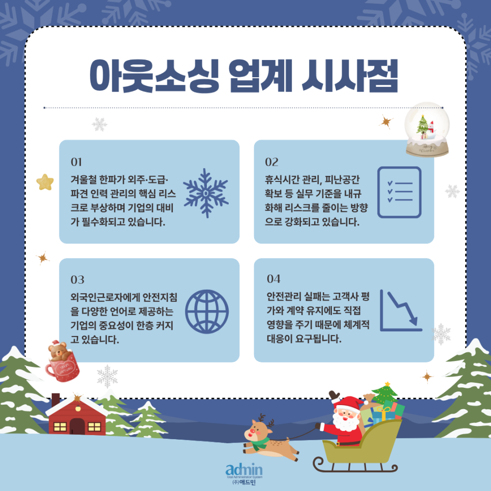 연동해야 안전 및 법적 리스크를 최소화할 수 있습니다. 정부는 향후 현장 점검을 확대할 예정이며, 근로자 보호 조치를 소홀히 한 사업장에는 행정조치가 강화될 가능성도 제기됩니다. 따라서 기업은 방한 장비 지급, 휴식 보장, 피난 공간 확보, 작업시간 조정 등 실질적 관리항목을 내규화하고, 외국인 근로자를 위한 언어별 안내 체계를 구축하는 것이 요구됩니다. 계절별 위험요소 관리는 단순 복지의 문제가 아니라 기업 신뢰도와 계약 유지에도 직결되는 요소로, 구조적 대응이 필요한 시점입니다.