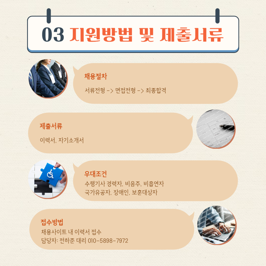 우대조건: 수행기사 경력자, 비음주, 비흡연자, 국가유공자, 장애인, 보훈대상자
