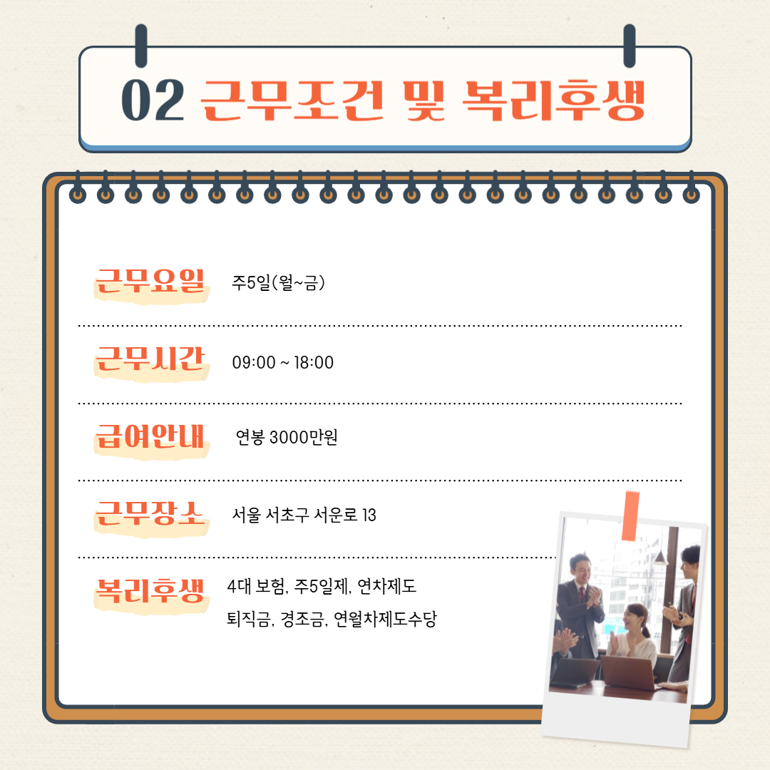 복리후생: 4대 보험, 주5일제, 연차제도, 퇴직금, 경조금, 연월차제도수당