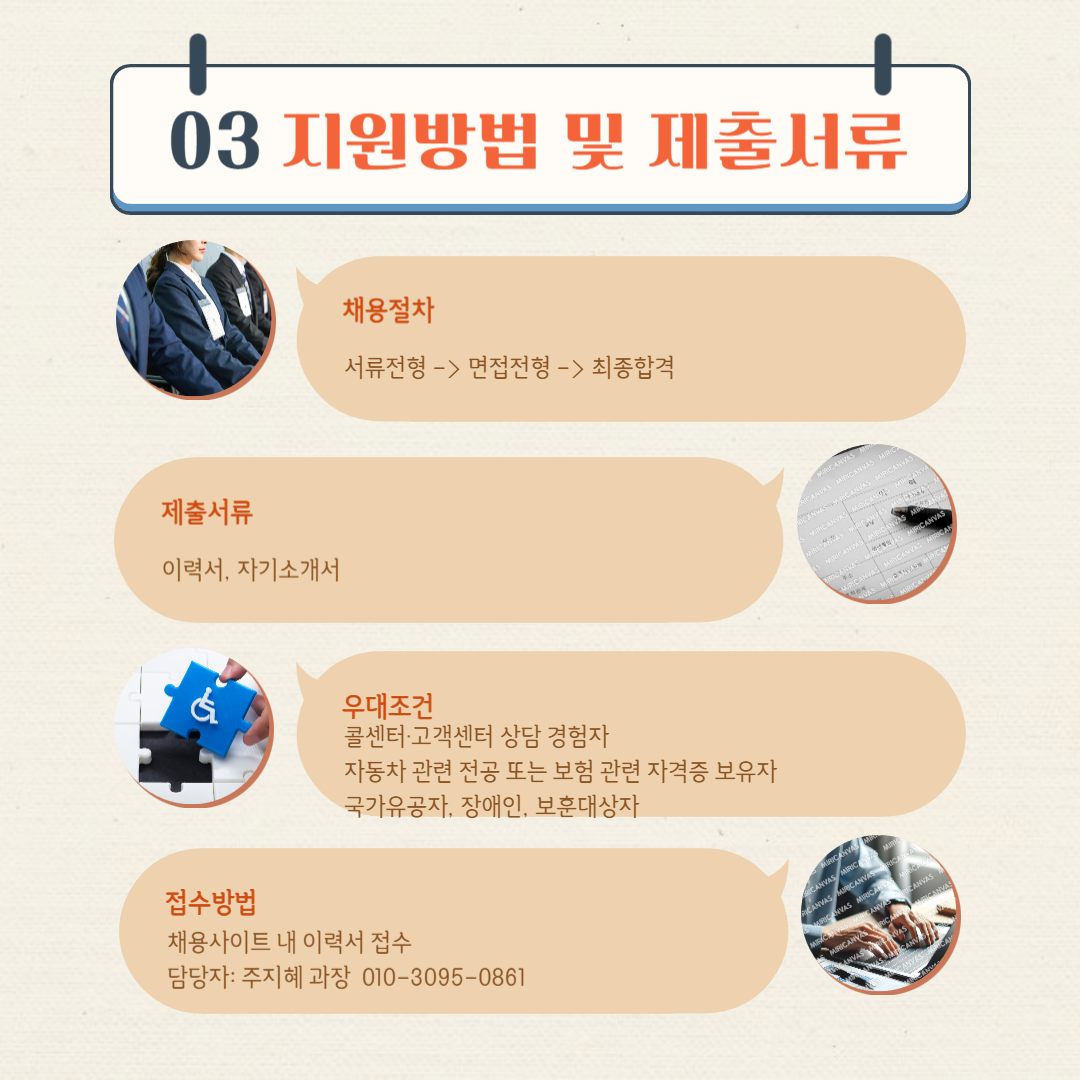 우대조건: 콜센터:고객센터 상담 경험자, 자동차 관련 전공 또는 보험 관련 자격증 보유자, 국가유공자, 장애인, 보훈대상자