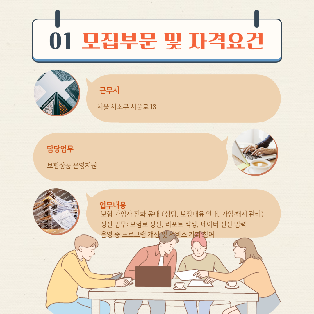 업무내용: 보험 가입자 전화 응대(상담, 보장내용 안내, 가입·해지 관리), 정산 업무: 보험료 정산, 리포트 작성, 데이터 전산 입력, 운영 중 프로그램 개선 및 서비스 기획 참여