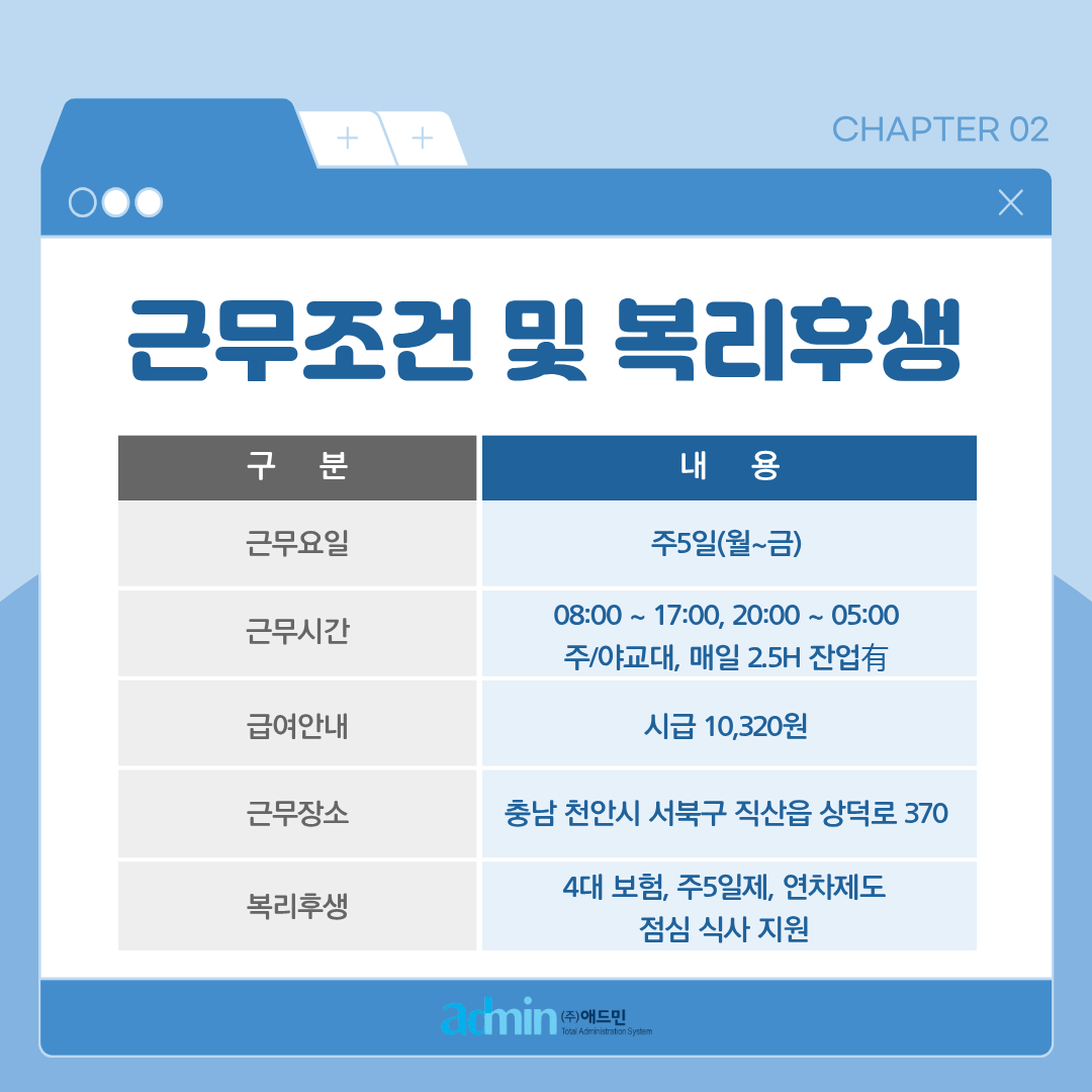 복리후생: 4대 보험, 주5일제, 연차제도, 점심 식사 지원
