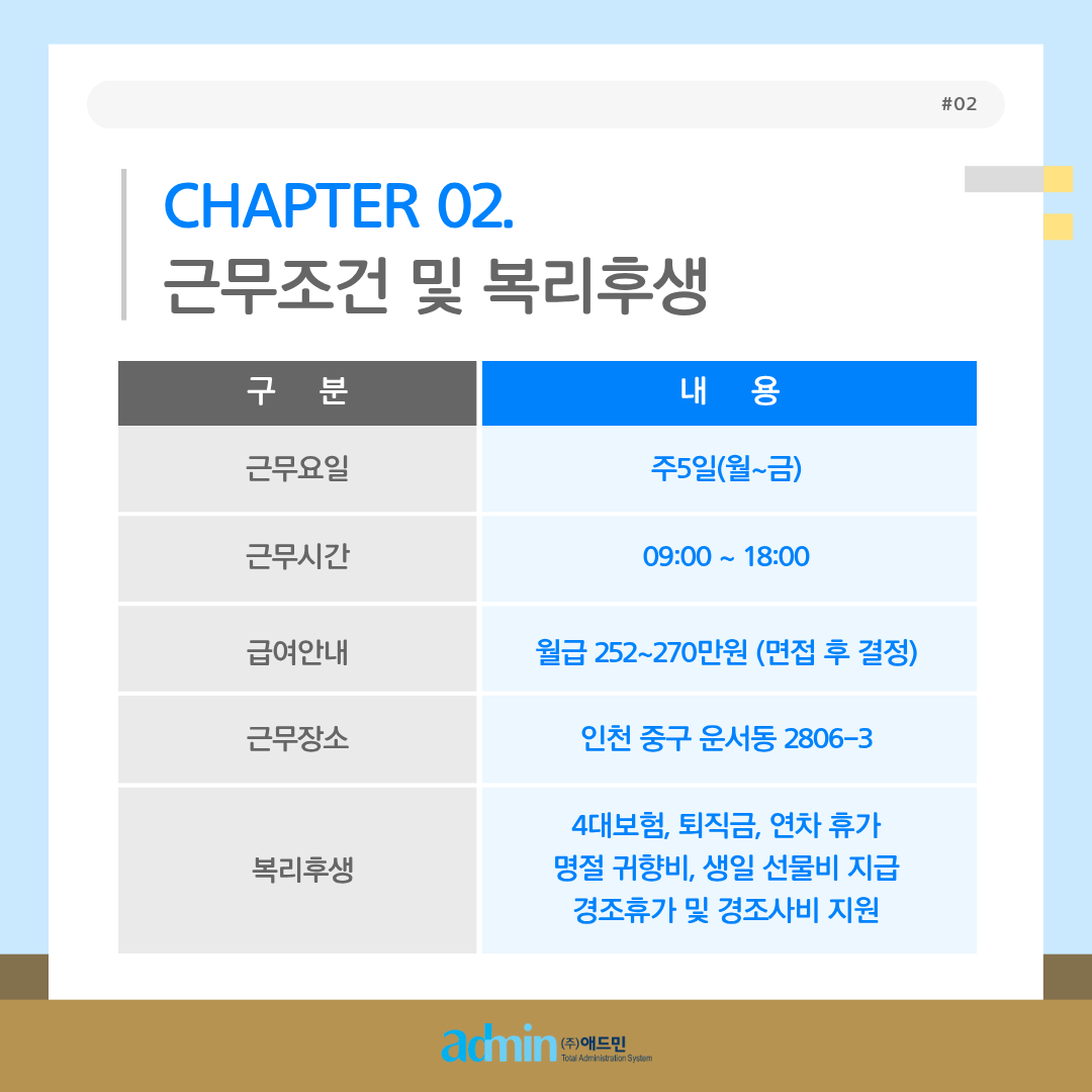 복리후생: 4대 보험, 퇴직금, 연차 휴가, 명절 귀향비, 생일 선물비 지급, 경조휴가 및 경조사비 지원