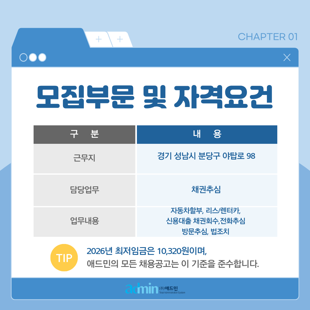 업무내용: 자동차할부, 리스/렌터카, 신용대출 채권회수, 전화추심, 방문추심, 법조치
