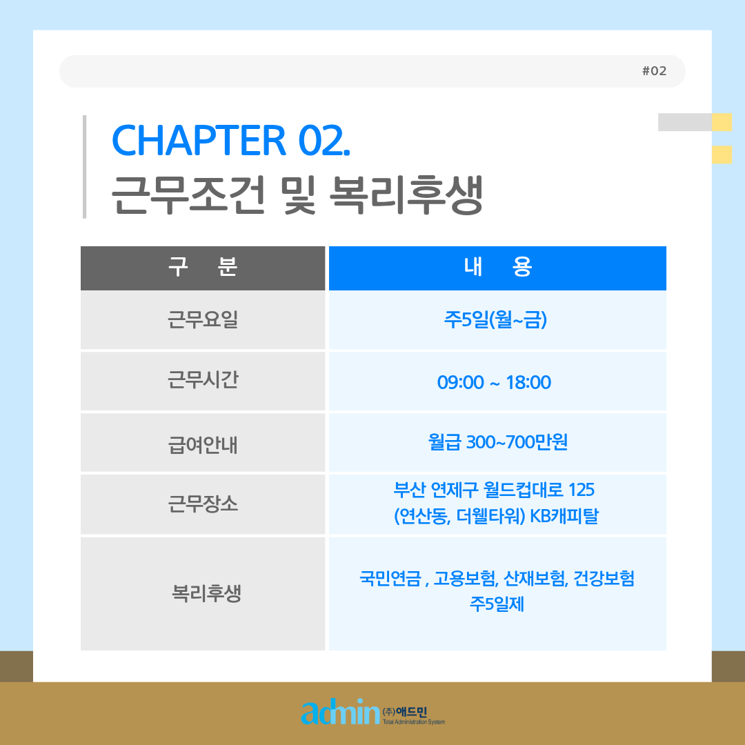 복리후생: 국민연금 , 고용보험, 산재보험, 건강보험, 주5일제
