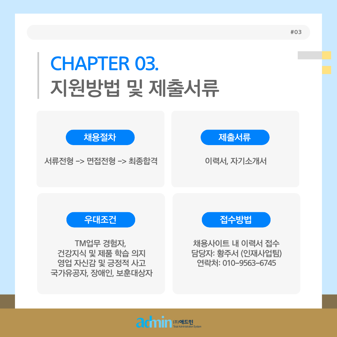 우대조건: TM업무 경험자, 건강지식 및 제품 학습 의지, 영업 자신감 및 긍정적 사고, 국가유공자, 장애인, 보훈대상자