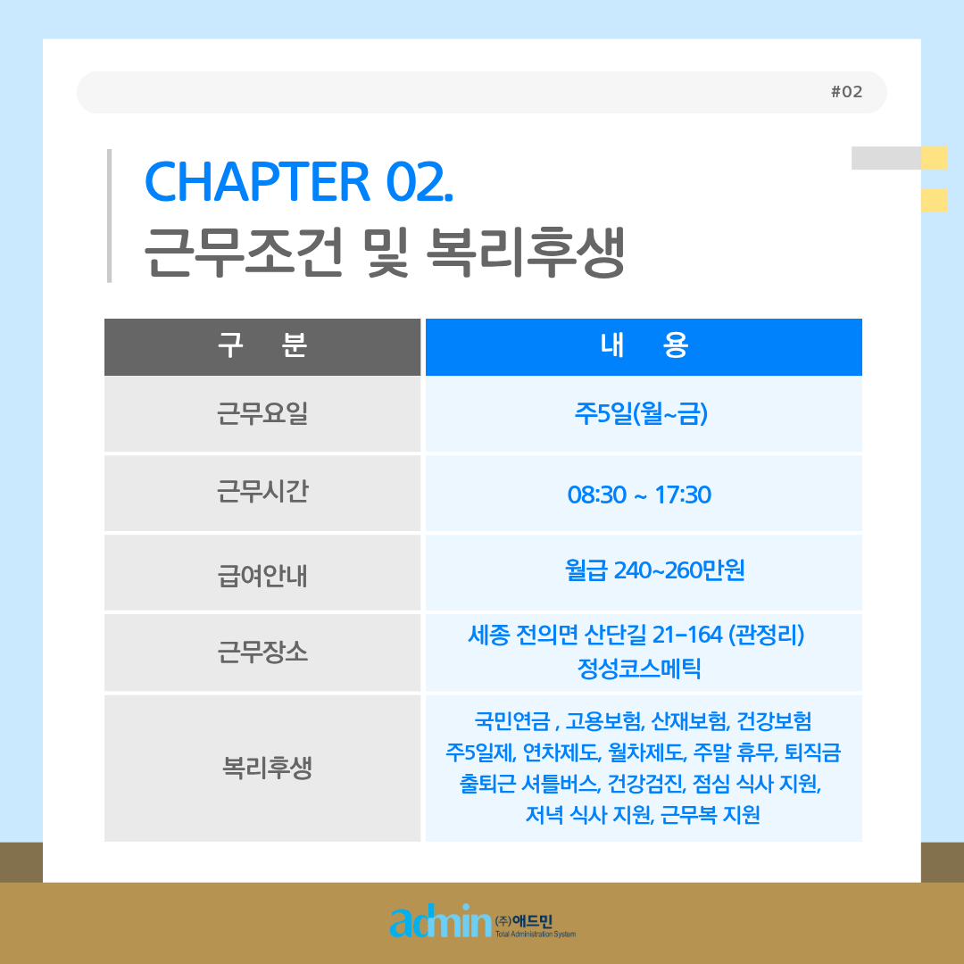 복리후생: 국민연금 , 고용보험, 산재보험, 건강보험,주5일제, 연차제도, 월차제도, 주말 휴무