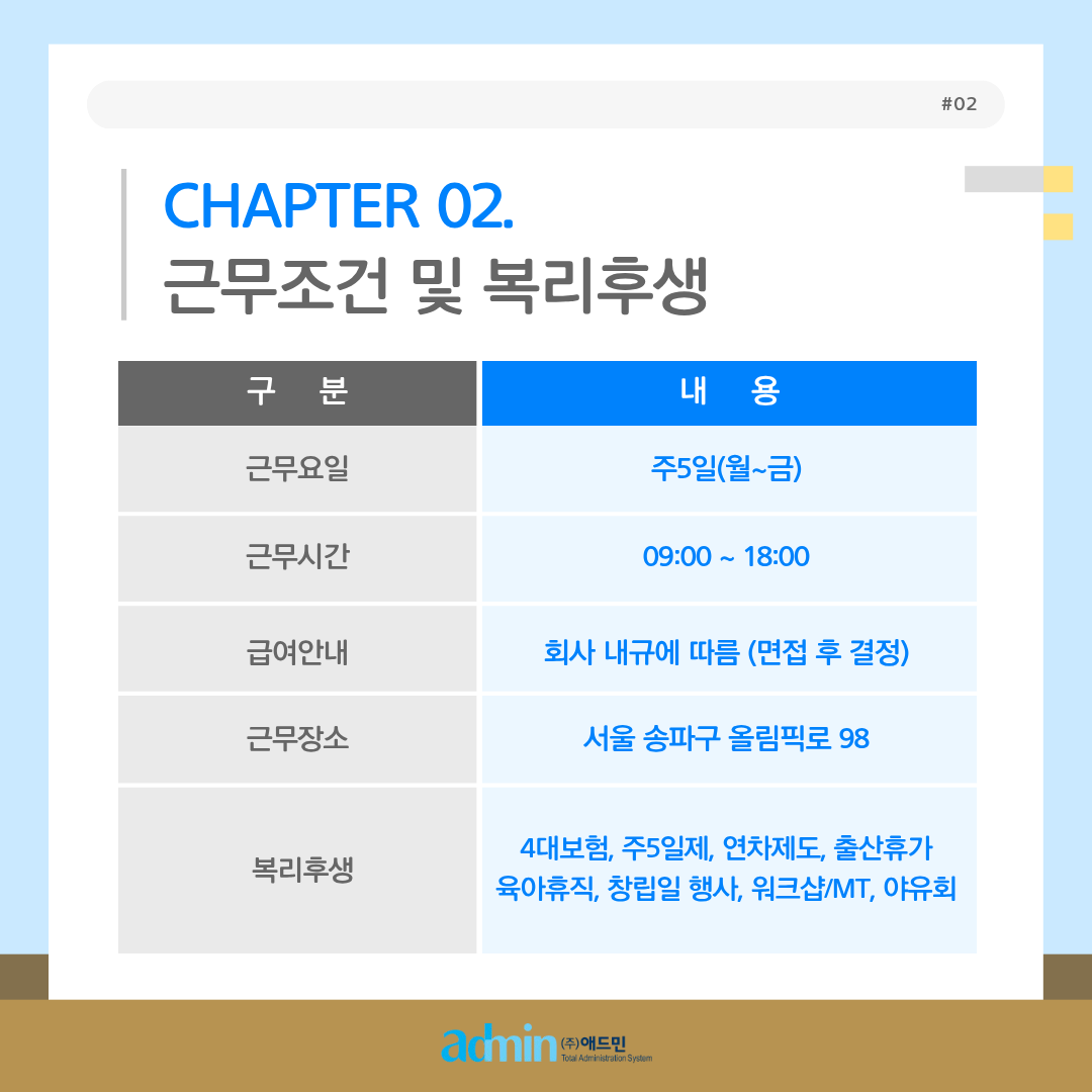 복리후생: 4대보험, 주5일제, 연차제도, 출산휴가, 육아휴직, 창립일 행사, 워크샵/MT, 야유회