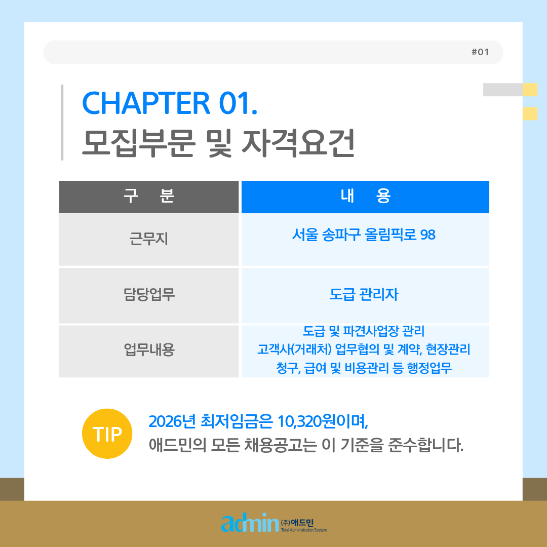업무내용: 도급 및 파견사업장 관리, 고객사(거래처) 업무협의 및 계약, 현장 관리, 청구, 급여, 비용관리 등 행정업무