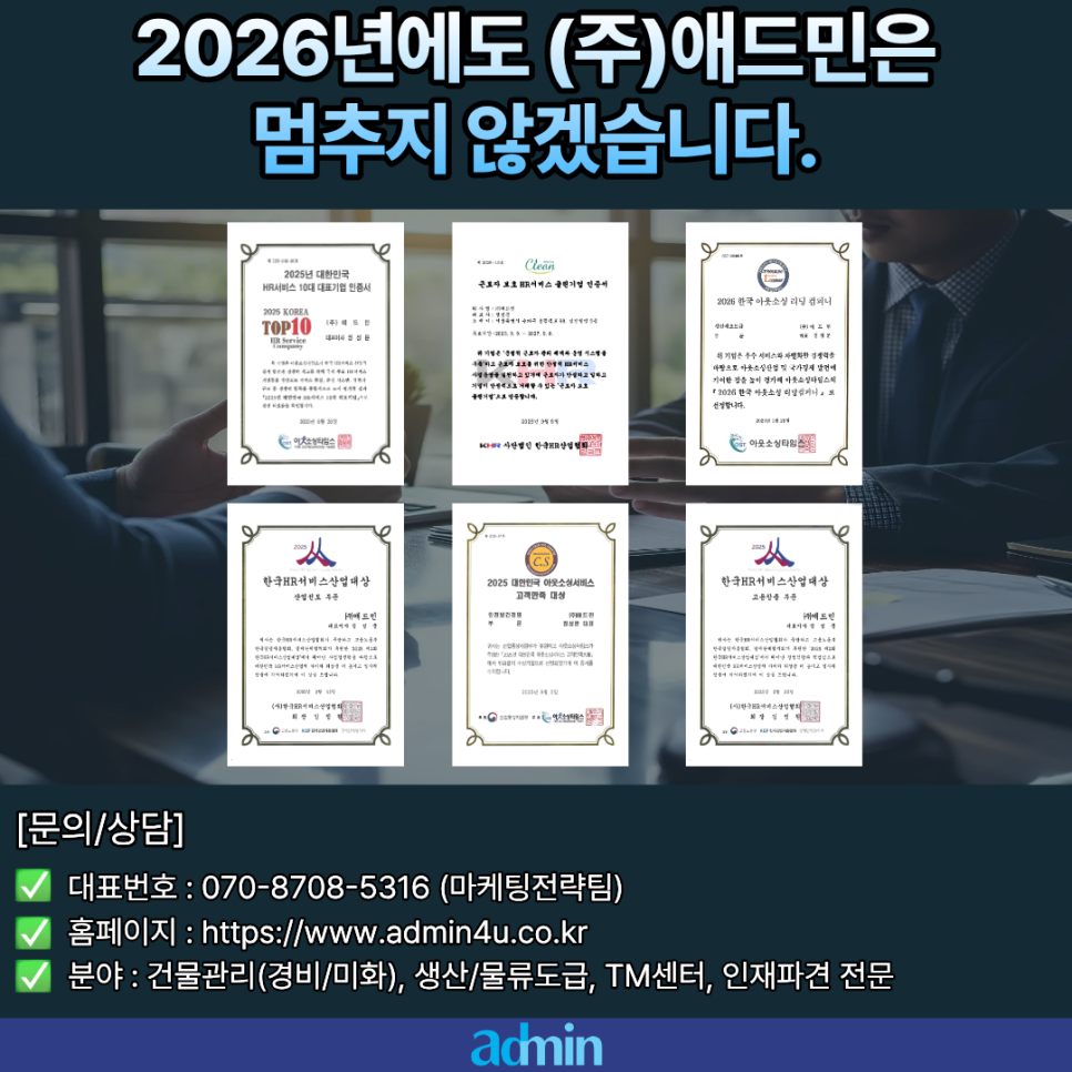 앞으로도 애드민은 건물관리, 물류, 인재파견, TM센터 등 전 분야에서 업계 표준이 되는 퀄리티를 선보이겠습니다.